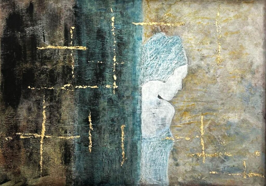 I bagliori dorati si intrecciano come una trama misteriosa, intima, ancora da scrivere o da ricostruire, metafora di una resistenza gentile che unisce le due metà della vita: l’ombra e la luce, la perdita e la rinascita